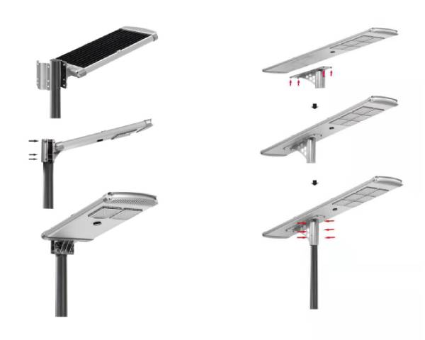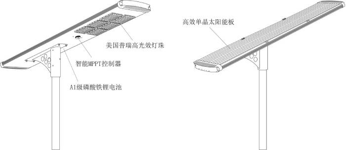 PAD款一体化太阳能路灯采用高效单晶光伏板,智能MPPT控制器,长寿命磷酸铁锂电池,高光效LED灯珠,集于一体化设计,安装使用方便。