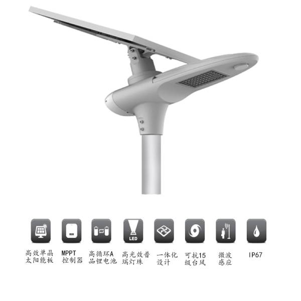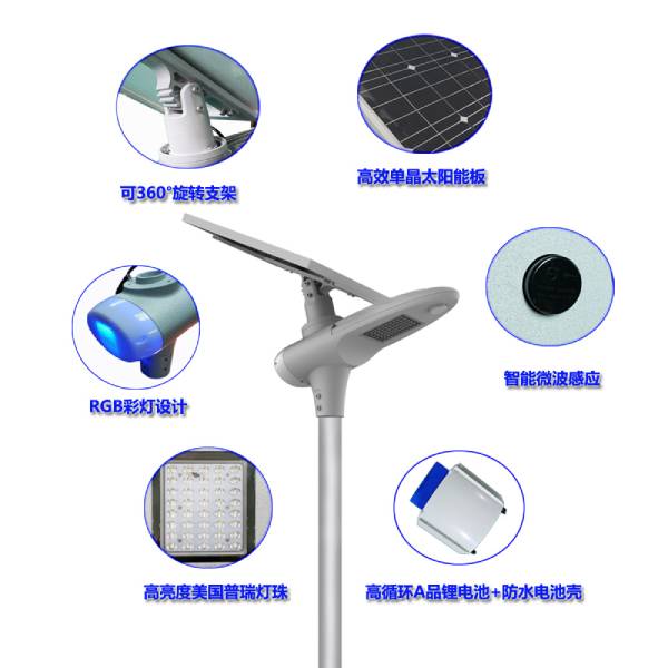 弟二代一体化太阳能路灯采用高效单晶光伏板,智能MPPT控制器,长寿命锂电池,高光效灯珠,集于一体化设计,安装使用方便,并拥有微波感应和RGB彩灯设计,实现多功能亮灯