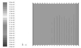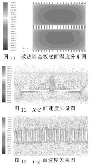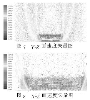 散热器自然对流过程中,基板底面不断地提供热量,由于散热器材料良好的导热性,热量使散热器温度不断提高。靠近散热器周围的空气受热,密度变小,与远离散热器的空气形成密度差,产生了浮力。在散热过程中,数值计算结果可以得到在Y-Z面中的速度矢量场如图7所示。可以直观地看出空气因为散热器的基板底面 在浮力的作用下,扰流冷却散热器的时候,空气直接从散热器四周往上走,却不能进入散热器肋片间对散热器进行冷却。在电加热板的加热量与散热器的散热量平衡 时,散热器肋片都成了等温壁面。速度又是由温度差引起的,速度小导致空气的浮生力小于粘性力。散热器周围的冷空气从散热器四周往上运动,到最终混为一起的 时候,在散热器肋片的上方形成了一个很大的滞流区域。从图8 X-Z面的速度矢量图可以看出在肋片方向上的滞流区域里的两端形成了两个小涡,阻止了周围空 气进入散热器肋片里。又因为在粘性力的作用下,这个滞流区域里空气流速非常小,所以在这样的结构下,散热器的肋片就没有充分发挥出自然对流的散热效果。