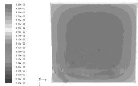 为了分析新结构散热器的散热能力,对比实验验证了数值计算可靠性,所以我们采用同样的数学模型、网格划分、计算方法和边界条件来数值计算分析,这样省 时,高效,成本低。计算结果显示散热器新结构的基板底面温度分布图如图10所示。在相同功率下,虽然基板底面受热面积有所减小,底面单位热流密度有所增 加。但是散热器的基板底面最高温度依然比原模型降低了5℃。肋片平均换热系数也由5.1W/(m2·K)提高为6.0W/(m2·K)。从X-Z面,Y- Z面上的速度矢量图11、12可以看出新结构在散热器中间实现了空气上下流通,增加了空气的流通量,受热空气扰流散热器中部肋片时的最大速度也只有 0.9m/s左右,这种新结构下,当工作环境在有风的条件下,更会强化换热效果,使散热效果更佳。这种新结构加工程序简单,减轻了散热器的重量和总的金属 消耗量,也方便于自动化生产及安装。