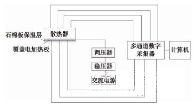 为了确保数值计算所选的数学模型、网格划分、计算方法和边界条件的可靠性,我们做了实验研究。实验测量过程在一个不受干扰的封闭空间进行,实验系统图如图5所示。在试验中,散热器基板底面覆以电加热板,用以模拟LED灯组产生的热量。并在基板与电加热板间填涂导热硅脂,隔绝空气热阻。电加热板下方用石棉板绝热使电加热板产生的热量全部由散热器散出。