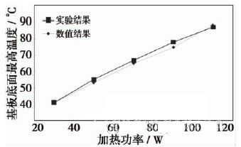 本文中实验加热功率间隔为20W,从30~110W的范围内进行,基板底面最高温度分别为41、55、67、78和87℃。对应的数值计算基板底面最高 温度分别为41、53、65、75和88℃。从实验和数值计算结果可以看出随着加热功率的提高,散热器的基板底面最高温度也随之提高,成线性变化。实验结 果和数值计算结果的对比如图6所示,相对误差率在1%范围内,说明数值分析结果是可靠的。