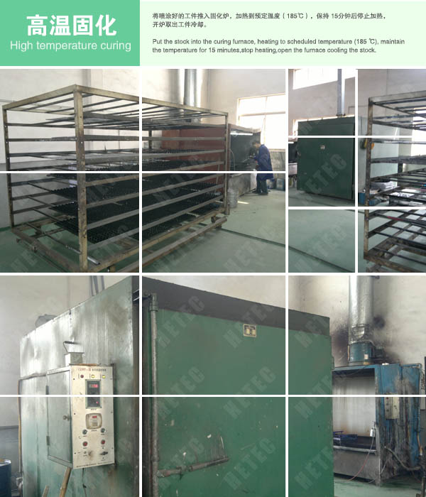将喷涂好的工件推入固化炉,加热到预定温度(185℃),保持 15分钟后停止加热,开炉取出工件冷却。